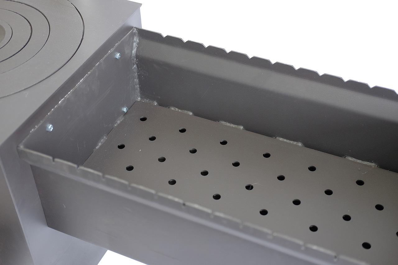 Также мангал для дачи, как и очаг для казана, оснащены выдвижными и емкими зольниками с удобными ручками, позволяющими удалять остатки продуктов горения, сохраняя чистоту вокруг зоны барбекю.