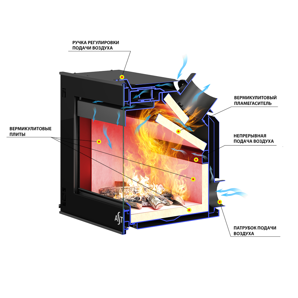 Стальной кожух каминной топки отстоит от корпуса на 3-4 сантиметра, что обеспечивает отличные конвекционные свойства теплового агрегата. Холодный воздух захватывается в щель снизу под дверью и, нагреваясь, выходит в верхней части боковых стенок кожуха. Таким образом обеспечивается быстрый прогрев помещения или объёма, расположенного под облицовкой камина.