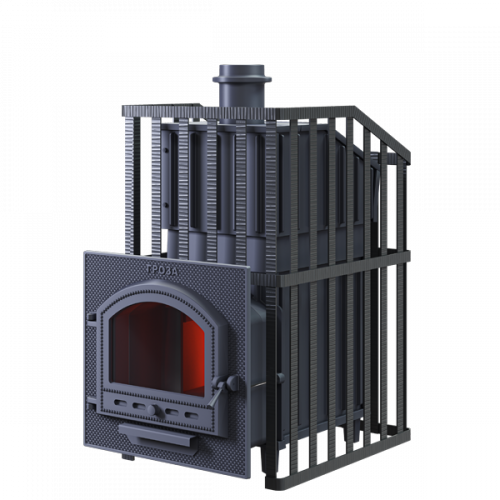 Печь для бани Гроза Ураган - расширенный комплект печи в сетке. Максимально приближенный вариант печи для режимов русской парной, имеющий непосредственно закрытую чугунным коробом каменку, дверцу для пара с ручкой из бука, увеличенную до 50 см чугунную стартовую трубу. Печь легко модернизируется до полноценной печи предназначенной для Русской бани путем замены стальной сетки на каменную облицовку без демонтажа дымохода. Модель Гроза Ураган выполнена на базе топочного агрегата Гроза - экономичная модель для частного применения. Основной принцип работы печи сохранён – получение пара с теплоёмкой каменки прямого нагрева. Каменка является сводом топки, нагревается с нижней поверхности снабженной теплосъемными шипами для увеличения контакта с пламенем.